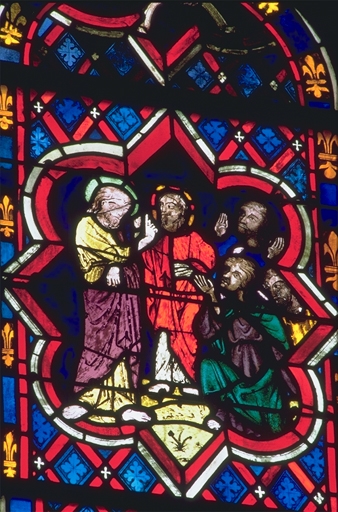 Verrière de la baie 100 (verrière légendaire) : Jugement dernier, Vie du Christ, Histoire d'Abraham, Vie de sainte Catherine, Vie de sainte Marguerite, évocation des évêques de Dol,
