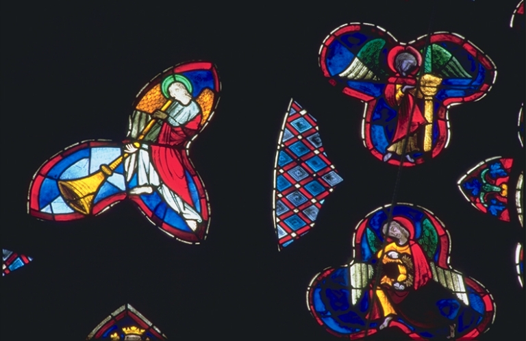 Verrière de la baie 100 (verrière légendaire) : Jugement dernier, Vie du Christ, Histoire d'Abraham, Vie de sainte Catherine, Vie de sainte Marguerite, évocation des évêques de Dol,