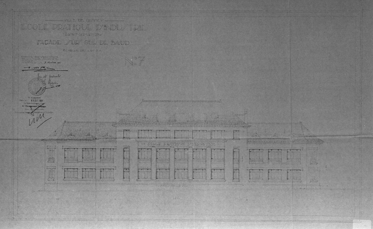 École pratique d'industrie. Transformations. Façade sur rue du Gué du Baud. Dessin, Emmanuel Le Ray, mars 1931. (A.C. Rennes)Immatriculation