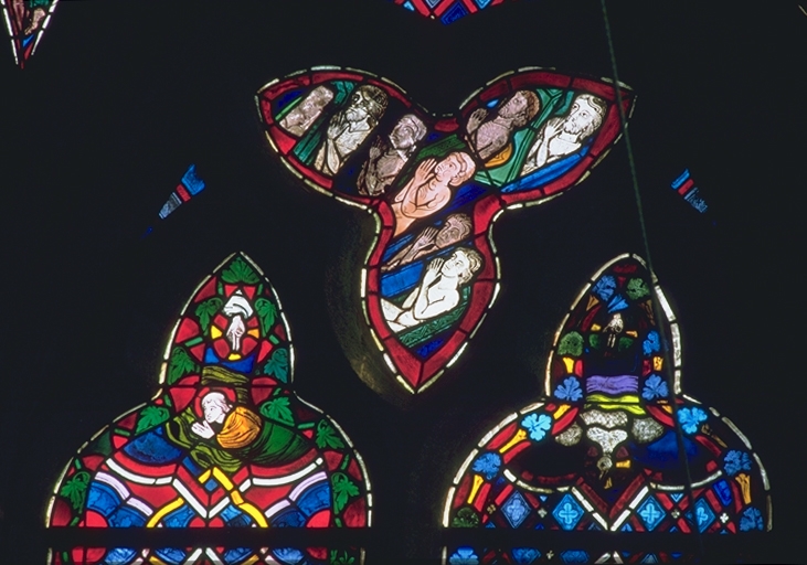 5e et 6e lancettes, 7e registre : ange en buste, main divine et colombe du Saint-Esprit ; tympan, 3e trilobe inférieurImmatriculation