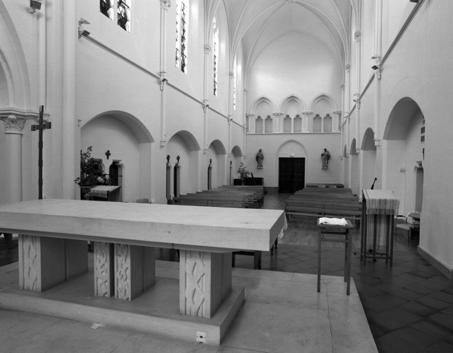 Intérieur de la chapelle 19ème siècle, vue depuis le choeur vers l'entrée avec les confessionnaux placés dans les bas côtés.Immatriculation