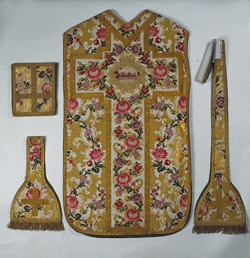 Ornement blanc 2 : chasuble, étole, manipule, bourse de corporal, voile de calice,