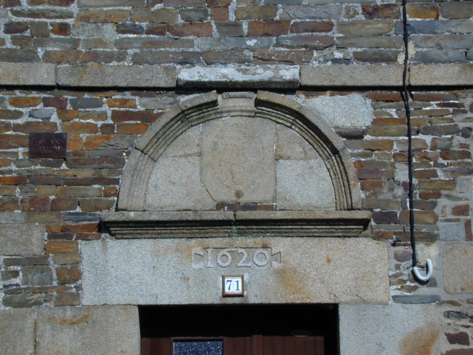 Le fronton semi-circulaire au dessus de la porte ; traces d'un écu marteléImmatriculation