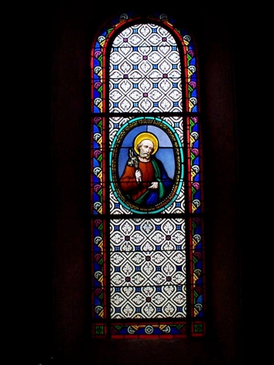 Ensemble des trois verrières du choeur (baies 0, 1, 2) : Immaculée Conception, sainte Anne, saint Joseph,