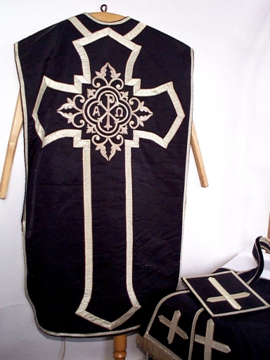 Ornement noir 1 : chasuble, étole, manipule, bourse de corporal, voile de calice,