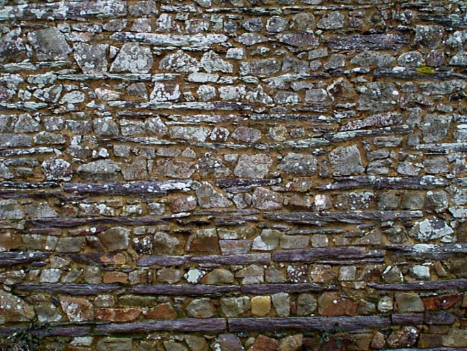 Haudebert, murs de grès et schistes montés en assises alternées : détailImmatriculation