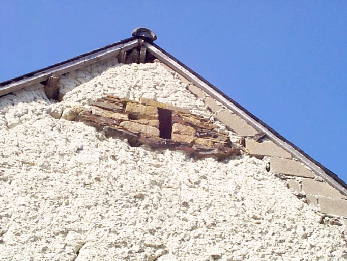 Petit 'jour' en moellons de schiste dans le pignon en terre de l'ancienne grangeImmatriculation
