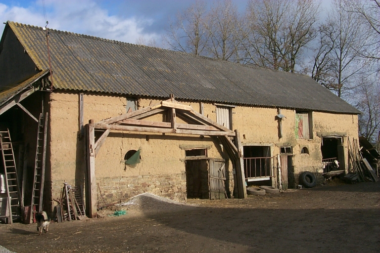 Etable à vaches et grange en terre : vue générale sud-ouestImmatriculation