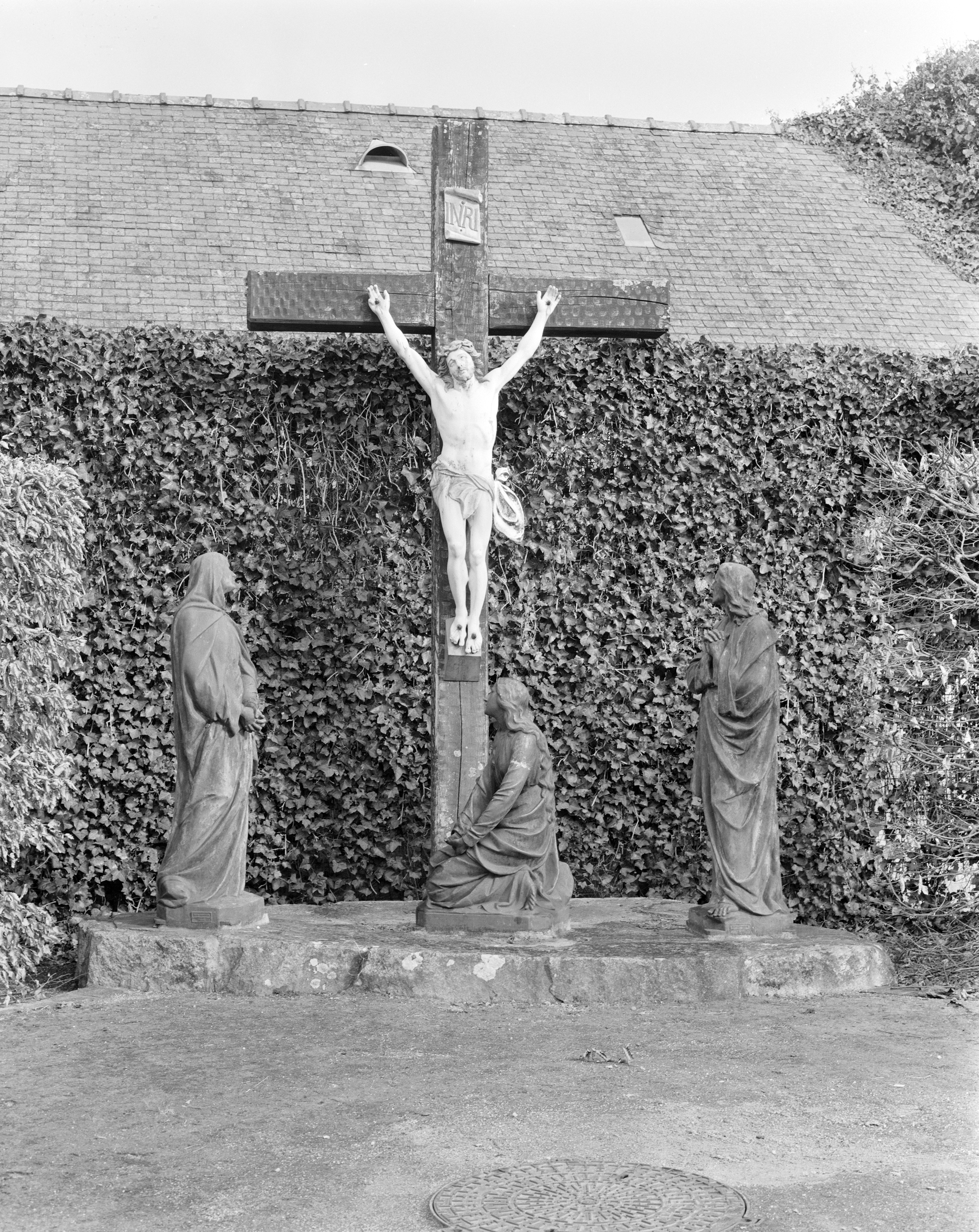 Au nord de l'église paroissiale, groupe sculpté de la Crucifixion, vue générale.Immatriculation