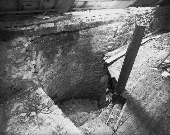 Kergarenne : logis, 1er étage, vue de la cheminée de l'escalier en visImmatriculation