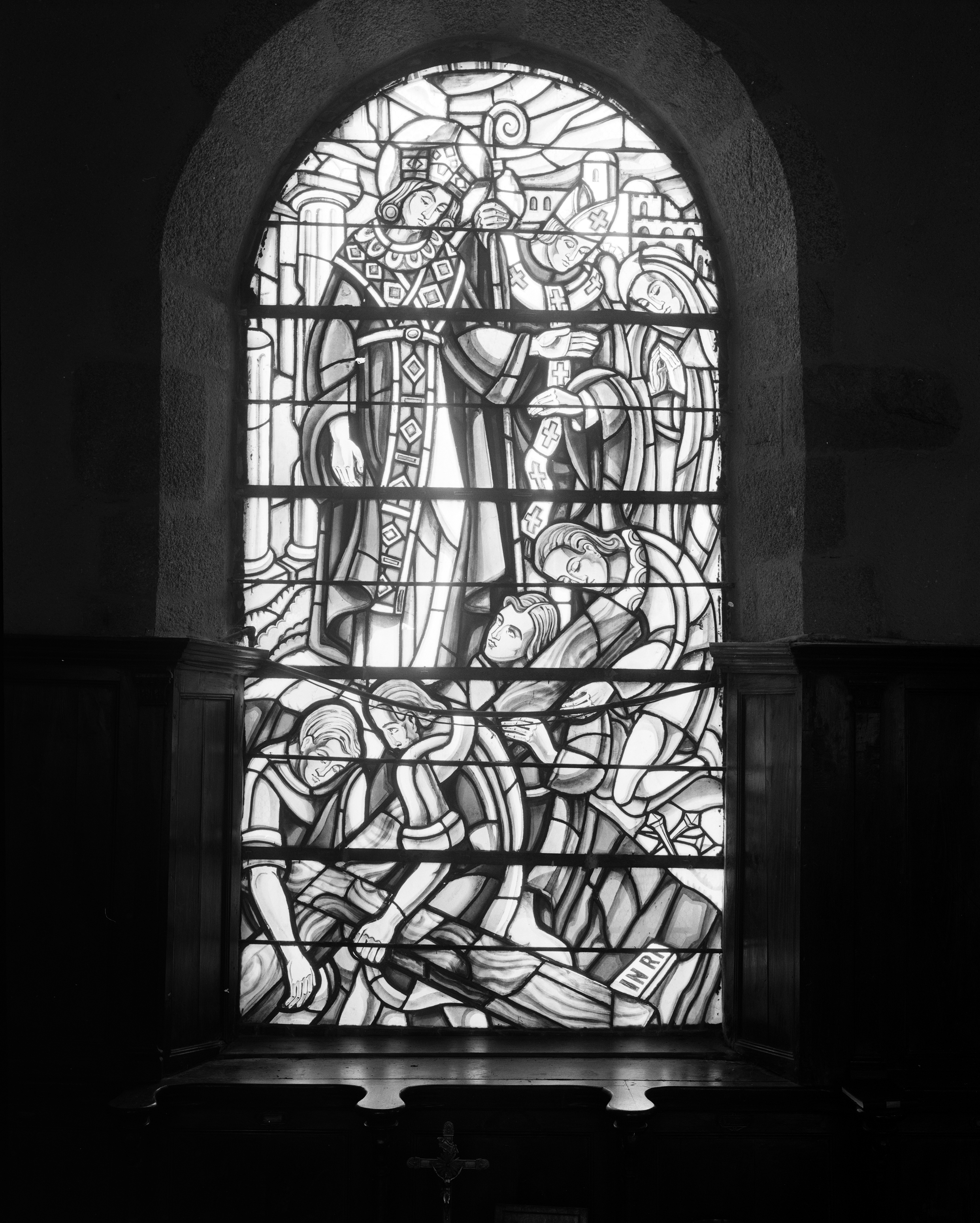 Verrière historiée : découverte de la sainte Croix par sainte Hélène (baie 2), église paroissiale Saint-Gérand (Cléguer),