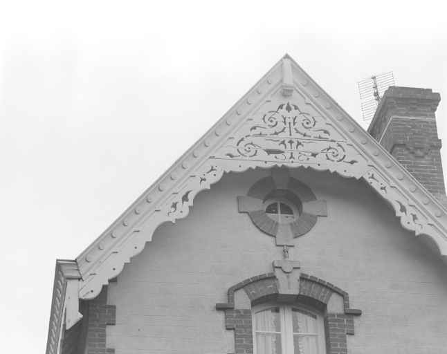 Détail du lambrequin de la façade antérieure (au niveau du mur pignon).Immatriculation