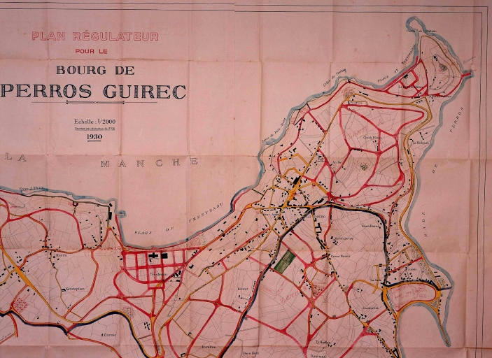 Plan régulateur pour le bourg de Perros-Guirrec par Gagnière géomètre, 1930 [réalisé en partie], éch. 1/20000e, encre et lavis de couleur sur papier cartonné.Immatriculation