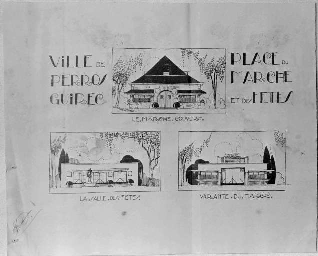 Ville de Perros-Guirec, place du marché et des fêtes : le marché couvert, la salle des fêtes, variante de marché, projet d'aménagement non réalisé, tirage sur papier, s.n.,octobre 1925.Immatriculation