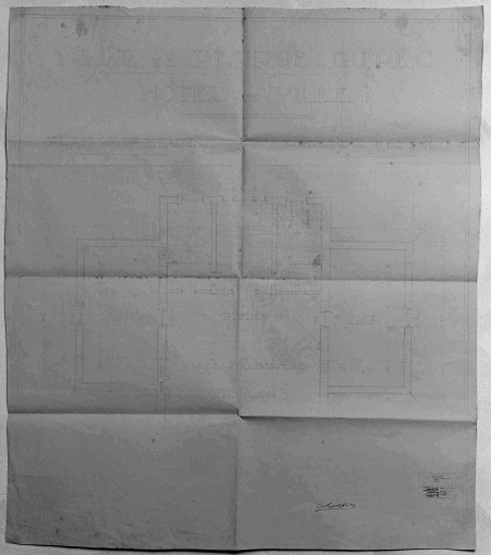 Hôtel de ville, Perros-Guirrec, plan du 1er étage, projet réalisé, tirage sur papier et lavis jaune par Jean Le Corre, architecte, 25 novembre 1932.Immatriculation