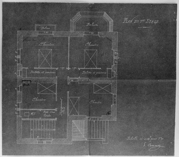 Plan du premier étage, plan tiré sur papier bleu par Paul Courcoux, architecte, s.d.Immatriculation