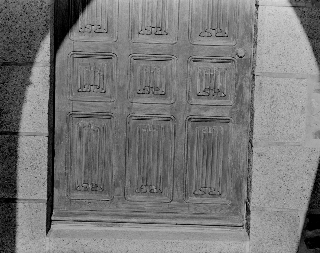 Détail du vantail de la porte d'entrée (décor en pli de serviette).Immatriculation