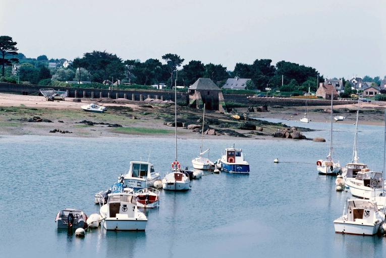 Moulin à marée de Trégastel et chaussée : vue depuis le port.Immatriculation