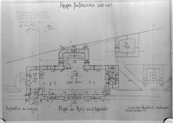 Propriété de M. Botrel, plage de Trestrignel, projet de villa réalisé, plan du rez-de-chaussée, encre sur calque, par P. Botrel vers 1902Immatriculation