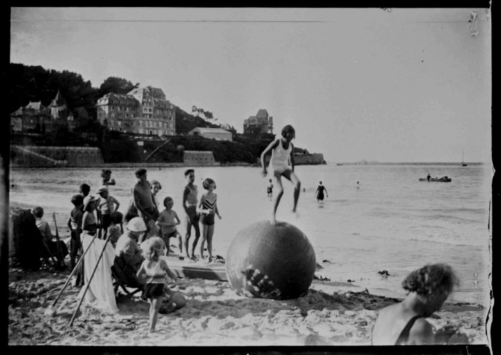 Scène de jeu sur la plage de Trestraou, vue depuis la pointe de Beg-ar-Stoloc'h, tirage d'après négatif sur verre par Hamon-Trémeur, 2ème quart du 20ème siècle (AD 35)Immatriculation