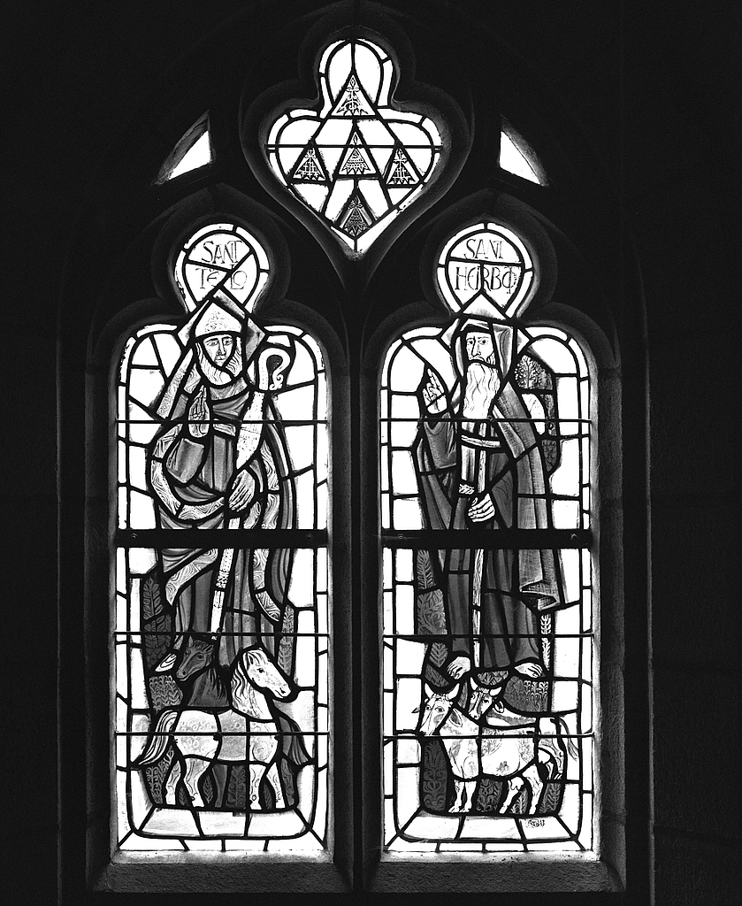 Verrière : crucifixion, verrière à personnages, église paroissiale Saint-Paban (Pouldreuzic),