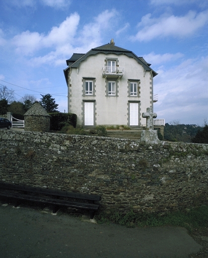 Vue générale : la façade sud ; à gauche : la guérite ; à droite, la Croix Bouessiée remployée dans le mur de clôtureImmatriculation