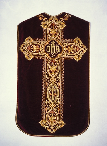 Ornement rouge 7 : chasuble, manipule, voile de calice, bourse de corporal, étole,