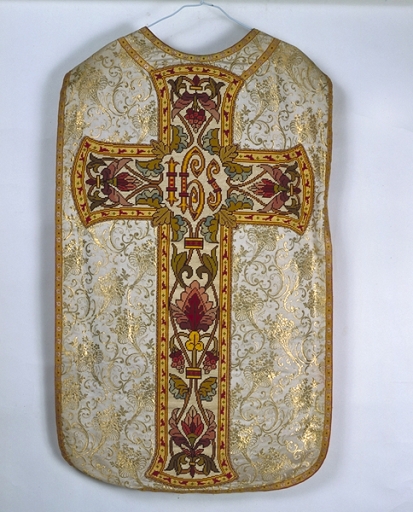 Ornement blanc 1 : chasuble, étole, manipule, voile de calice, bourse de corporal,