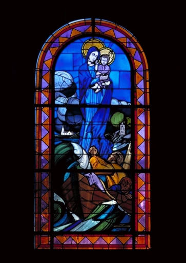 Ex-voto-verrière à personnages de la baie 3 : Vierge au-dessus des flots,