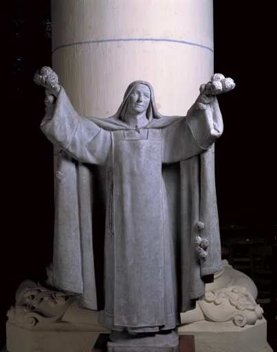 Statue : sainte Thérèse aux bras ouverts sous une pluie de roses,