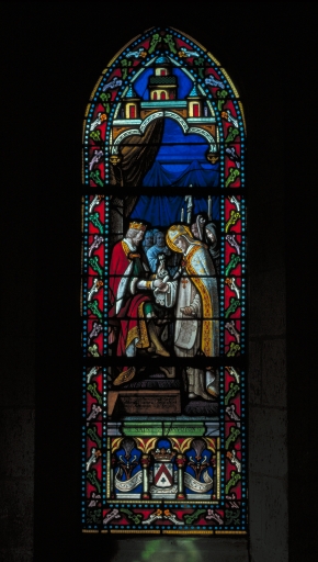 Ensemble des 14 verrières basses de la nef : saints Michel, Camille, Isidore, Coulomb, Méen, Convoyon, Malo, évêque, Cornely, Ange gardien, Baptême du Christ, Christ roi, Notre-Dame de Liège, Notre-Dame de Pontmain,