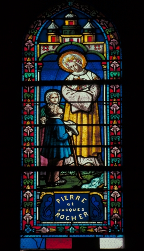 Ensemble des 8 verrières hautes du transept : saint Denis, sainte Agathe, saint Jean, Notre-Dame du Rosaire (?), saint Pierre, Notre-Dame de la Salette, saint Jacques le Mineur, Notre-Dame de Lourdes,