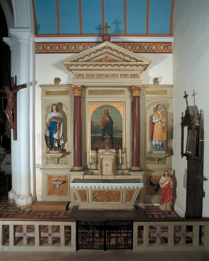 Ensemble de l'autel secondaire sud : degré d'autel, autel, 2 gradins d'autel, tabernacle, retable,