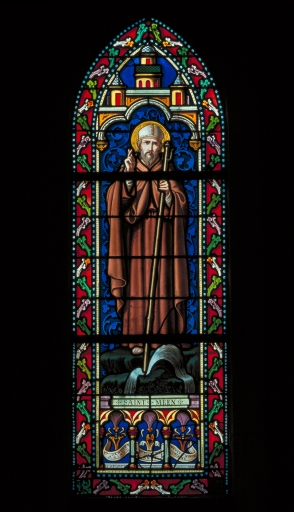 Ensemble des 14 verrières basses de la nef : saints Michel, Camille, Isidore, Coulomb, Méen, Convoyon, Malo, évêque, Cornely, Ange gardien, Baptême du Christ, Christ roi, Notre-Dame de Liège, Notre-Dame de Pontmain,