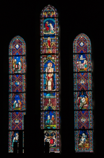 Ensemble des 2 verrières basses du transept : Vie du Christ, Vie de la Vierge,