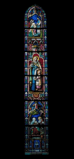 Ensemble des 7 verrières du choeur : saint Sixt, vie de saint Sixt (?), Crucifixion, sainte Anne, saint Joachim, saint Joseph, saint Louis,