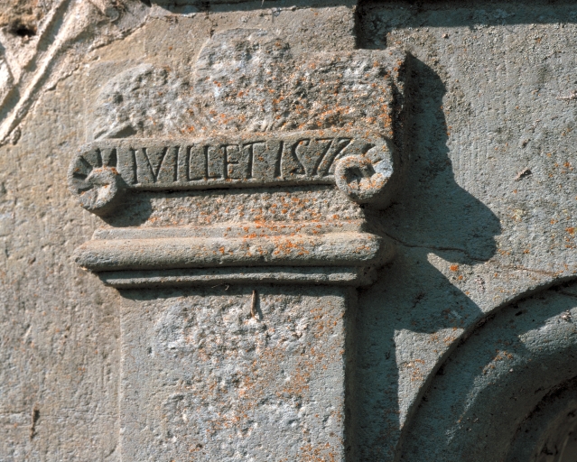 Logis, porte principale, pilastre portant la date juillet 1577 : détailImmatriculation