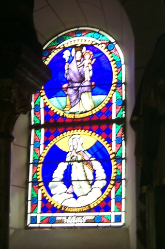 Ensemble des verrières à personnages des baies 1, 3, 5 : saint Jean-Baptiste ; sainte Marie-Madeleine ; Vierge à l'Enfant ; Assomption ; saint Joseph ; saint Maurice,