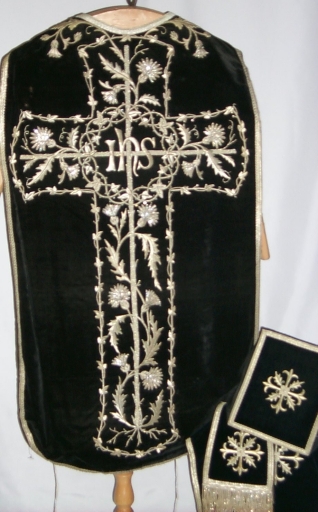 Ornement noir 2 : chasuble, bourse de corporal, voile de calice, étole, manipule,