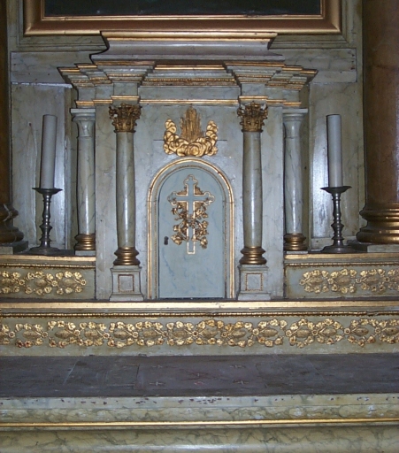 Ensemble de l'autel secondaire nord : autel, 2 gradins d'autel, tabernacle, retable, degré d'autel,