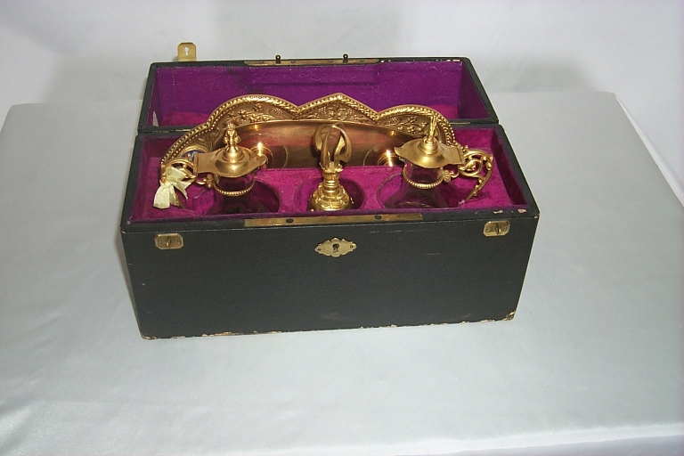 2 burettes & leur plateau, sonnette d'autel dans leur boîte,