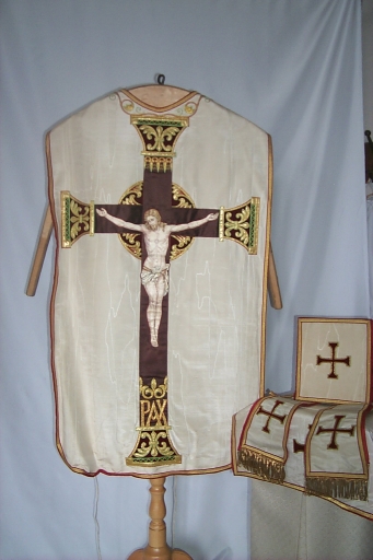 Ornement blanc 1 : chasuble, étole, manipule, bourse de corporal, voile de calice,