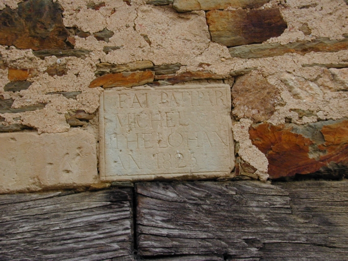 Détail : façade sud, inscription : 'FAI BATI PAR MICHEL HELOHAN ANNÉE 1823'Immatriculation