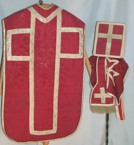 Ornement rouge 3 : chasuble, étole, bourse du corporal, voile du calice,