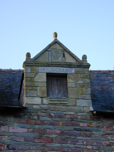 Détail : façade sud, lucarne centrale du logis ; les armes sculptées pourraient être celles de madame de Orhant, mère de Guillaume de RozImmatriculation