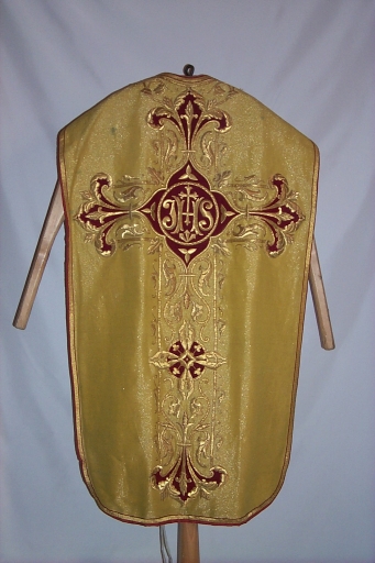 Ornement doré : chasuble, étole, manipule, voile de calice, bourse de corporal,
