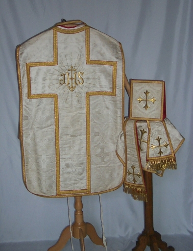 Ornement blanc 2 : chasuble, bourse de corporal, étole, manipule, voile de calice,