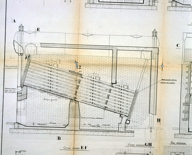 Détail du plan technique des fumisteries ; l'inclinaison des tubes, qui caractérise ce type de chaudière, est parfaitement visible sur ce plan.Immatriculation