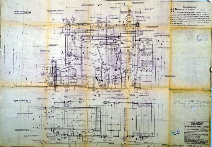Plan technique, coupe de la chaudière Babcock et Wilcox datée de 1937.Immatriculation