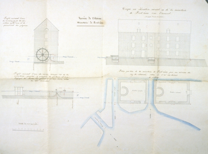 Plan et élévation du moulin, et profil du coursier (1854).Immatriculation